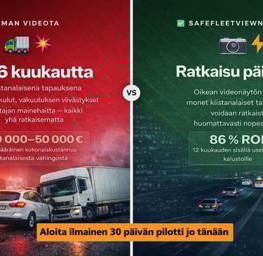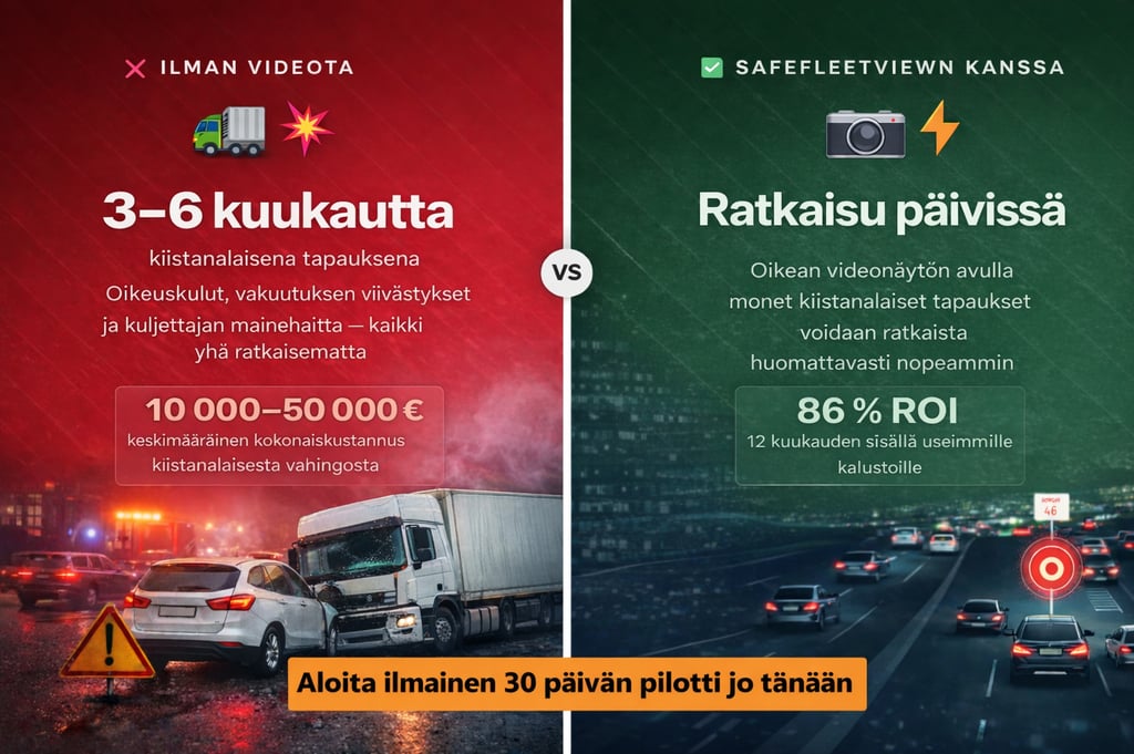 Yksi kiistanalainen onnettomuus voi aiheuttaa yritykselle 10 000–50 000 euron kokonaisvaikutuksen ja pitkittyä kuukausiksi. Oikean videonäytön avulla kalustosta vastaavat voivat siirtyä epävarmuudesta selkeään tilannekuvaan paljon nopeammin.